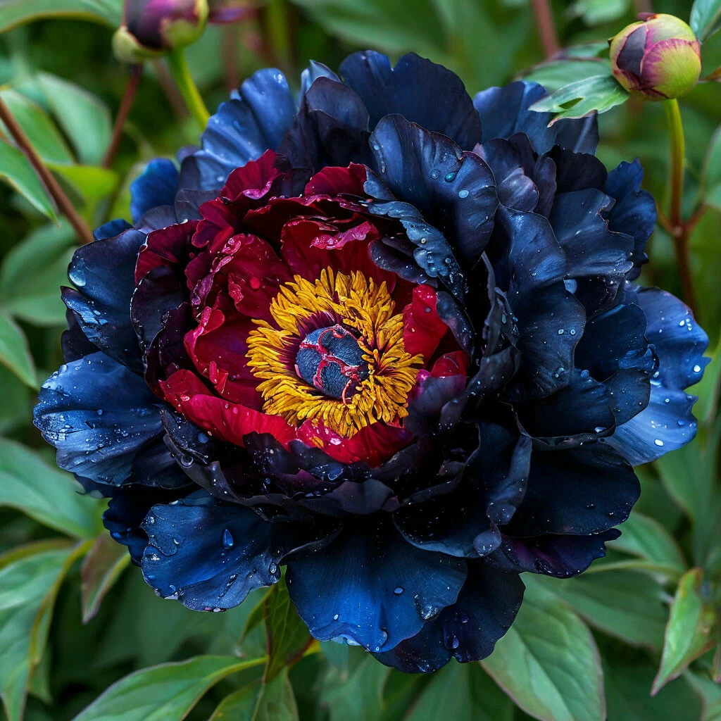 - Неповторимая окраска: главная особенность этого сорта — его уникальная и завораживающая окраска, словно сошедшая со страниц старинной сказки. Цвет переходит от насыщенной бордовой середины к глубоким темно-синим краям, создавая эффект глубины и таинственности. Сердцевина цветка украшена яркой оранжевой сердцевиной, добавляющей акцент света и тепла в эту сложную палитру.